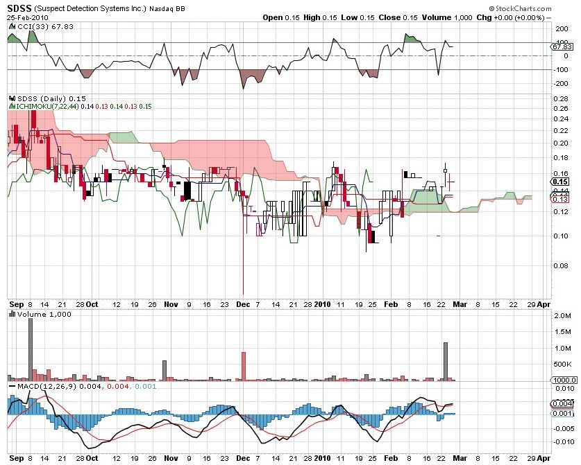 Der Ichimoku bestätigt die Signale des CCI und MACD. Der Kurs liegt über der Wolke auch der um 22Tage nach hinten versetzte Kursverlauf der grünen Linie steht über dem damaligen Kurs, wasc stärke signalisiert. Die Wolke unter dem Momentanen Kurs ist sehr dünn, was auf geringe Unterstützung hinweist. Nach dem derzeitigen Stand sollte sich das auch nicht so schnell ändern. Die gleitenden Durchschnitte, rote und blaue Linie, haben sich am 10.02 gekreuzt, innerhalb der Wolke und unterhalb des Kursverlaufes. Danach haben sie sich voneinander entfernt und wieder angenähert. Nach unten gekreuzt haben sie sich aber nicht. Man kann deshalb von einer starken Seitwärtsbewegung ausgehen die eine mittlere Tendenz nach oben hat. Damit währe die von den Candelstickformationen zum Kursverlaufsende beschriebene Marktunsicherheit nach Ichimoku, CCI und MACD eher durch einen Ausschlag nach oben widerlegt. Bestätigt wird das auch von dem ca Einmonatigem Aufwärtstrend der im Widerstandsbereich bei 0,16USD derweilen geendet hat. Diese Situation wäre Charttechnisch kurzfristig nicht aufzulösen. Da hilft nur Newsflow. Und da habe ich im thread ja auch schon etwas gelesen!