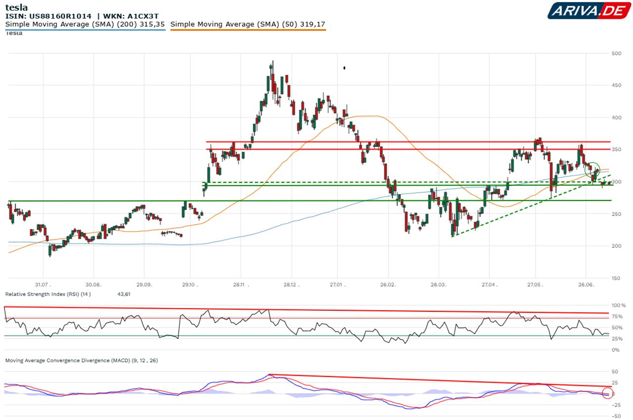 Aus technischer Perspektive sorgte vor wenigen Tagen ein Golden Cross für ein Kaufsignal. Ein solches entsteht, wenn die 50-Tage-Linie von unten her kommend über die 200-Tage-Linie steigt. In genau der Überschneidungszone ist die Tesla-Aktie aber auf einen kurzfristigen Widerstand getroffen und muss nun um den Verbleib oberhalb der Marke von 300 US-Dollar kämpfen.
