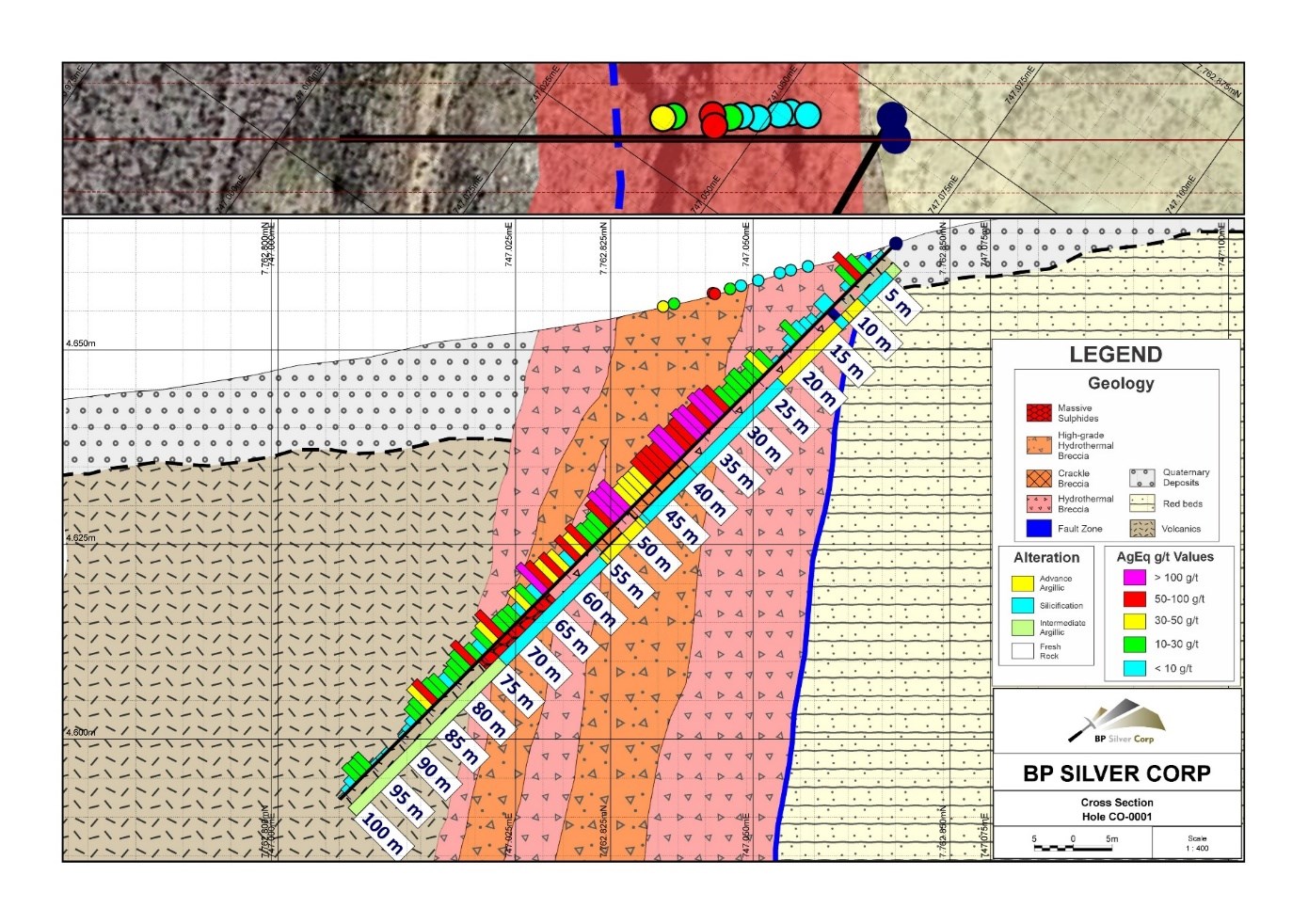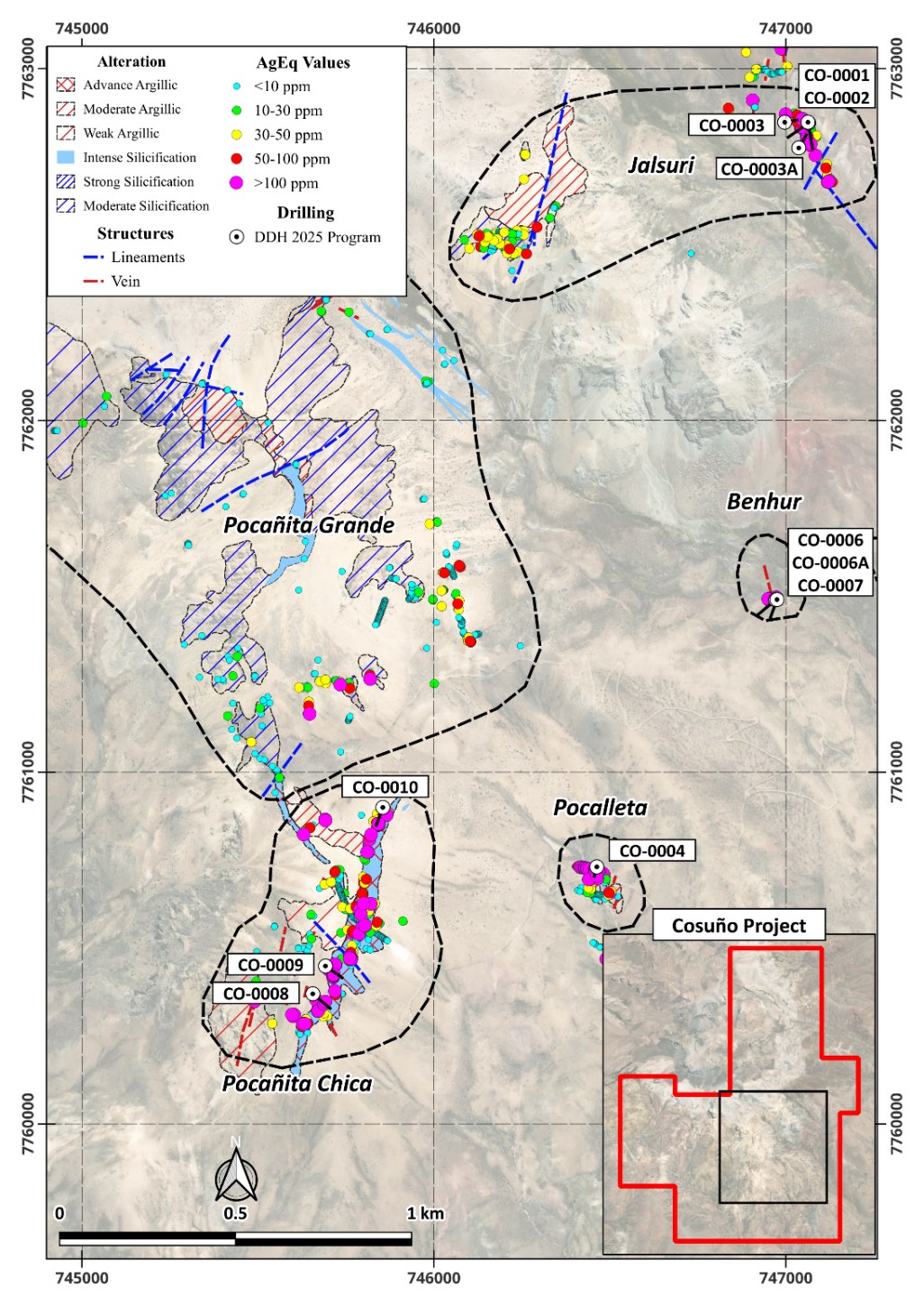 Die veröffentlichten Ergebnisse stammen aus den ersten beiden Bohrlöchern, Bohrloch CO-0001 und CO-0002. Diese erprobten eines der vier anfänglichen Oberflächenziele, die innerhalb des (etwa 10,5 km2) großen hydrothermalen Systems Cosuño identifiziert wurden (Tabelle 1 und Abbildung 1). Wie die Untersuchungen zeigen, setzt sich die an der Oberfläche identifizierte Silber- und Goldmineralisierung in der Tiefe innerhalb der Lithokappe fort. Die Ergebnisse sind bedeutsam, da mineralisierte Lithokappen in ähnlichen bolivianischen Systemen normalerweise unergiebig sind. Cosuño birgt also ein Potenzial für weitere Entdeckungen in der Tiefe und in Gebieten unter der Deckschicht.