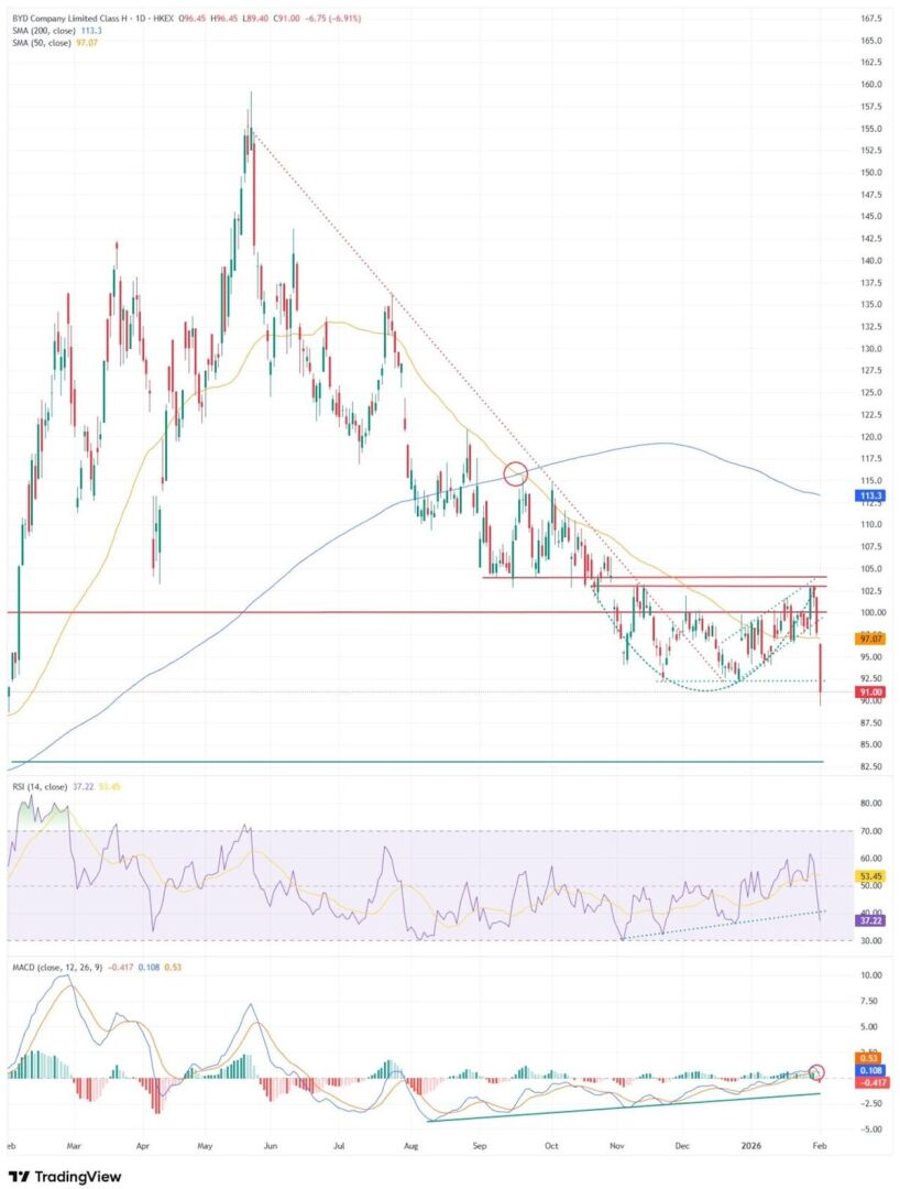Aufhellen würde sich das angeschlagene Chartbild erst wieder, wenn BYD (zum aktuellen Zeitpunkt kaum zu erwarten) über den Widerstandsbereich bei 104 HKD klettern sollte.