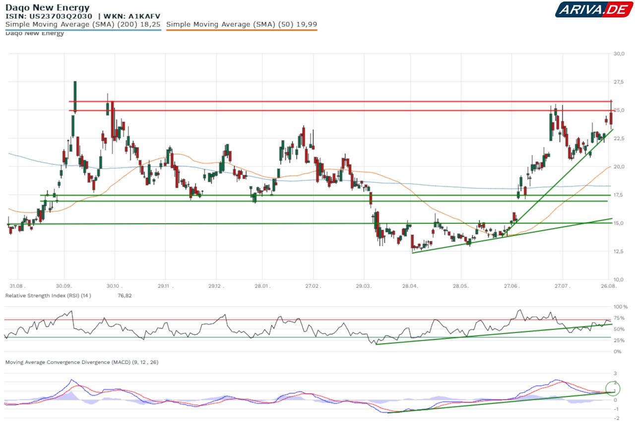 Auch bei Polysilizium, dem Grundstoff in der Zellherstellung, war es zu Überkapazitäten und einem Preisverfall gekommen. Das hat die Erträge von Daqo New Energy, einem der weltweit größten Hersteller noch vor Mitbewerbern wie dem MDAX-Wert Wacker Chemie, einbrechen lassen und zu einem Verfall des Aktienkurses geführt.