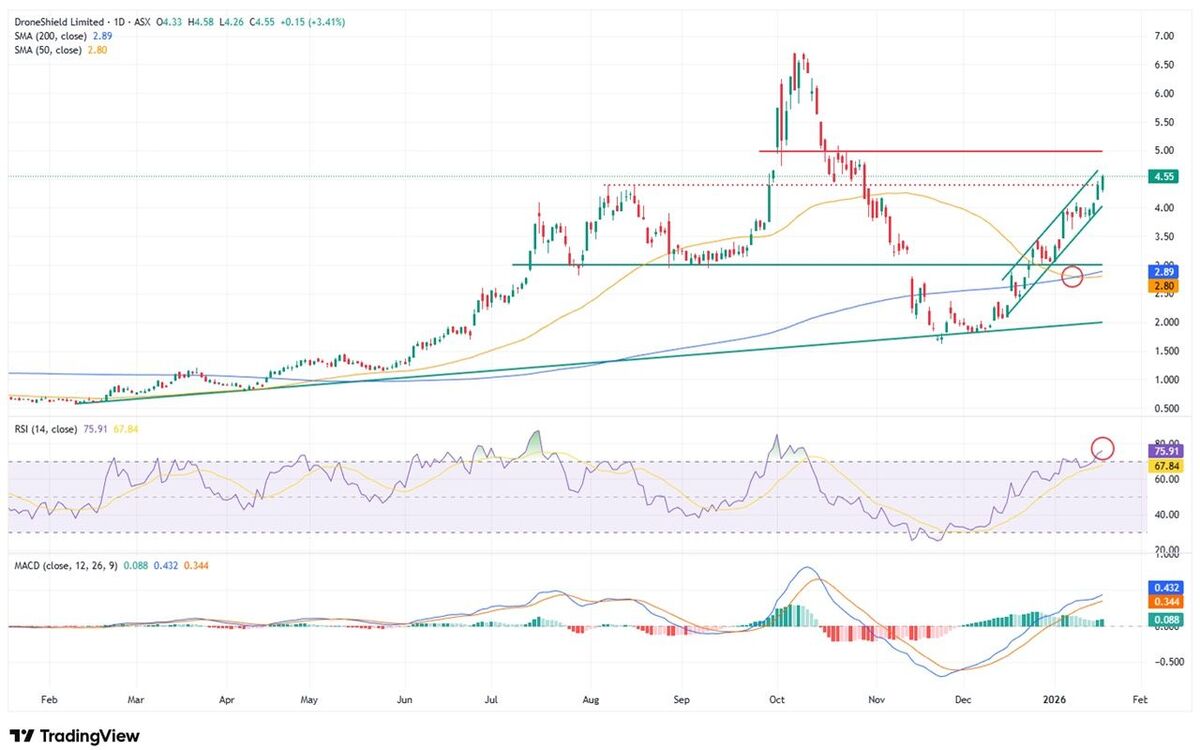Die DroneShield-Aktie ist gut erholt in das neue Börsenjahr gestartet. Trotz eines markanten Verkaufssignals verfügen die Anteile über viel technischen Rückenwind und könnten weiter steigen. Allerdings wird das Aufwärtspotenzial durch einen unmittelbar vor der Aktie liegenden Widerstand begrenzt, auch ist das Papier inzwischen als überkauft zu bezeichnen. Hier muss ab sofort jederzeit mit Rücksetzern gerechnet werden.