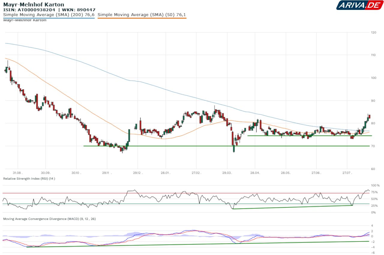 Immerhin: Von seinen Mehrjahrestiefs hat sich Mayr-Melnhof inzwischen deutlich entfernt. Das deutet auf einen Turnaround der Aktie hin, der von bullishen Divergenzen vor allem im Trendstärkeindikator MACD unterstützt wird.