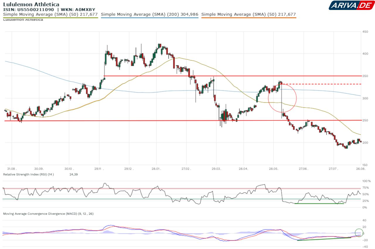 Insgesamt ist die Wall Street geteilter Meinung. Bei insgesamt 34 Empfehlungen kommt Lululemon 14 Mal auf "Kaufen" und zwei weitere Male auf "Übergewichten". Dem stehen 14 Bewertungen mit "Halten" gegenüber, während vier Analystinnen und Analysten das Reduzieren oder gar den Verkauf empfehlen. Im Mittel wird ein fairer Wert von 274,78 US-Dollar genannt, was ein Potenzial von 35,7 Prozent impliziert.