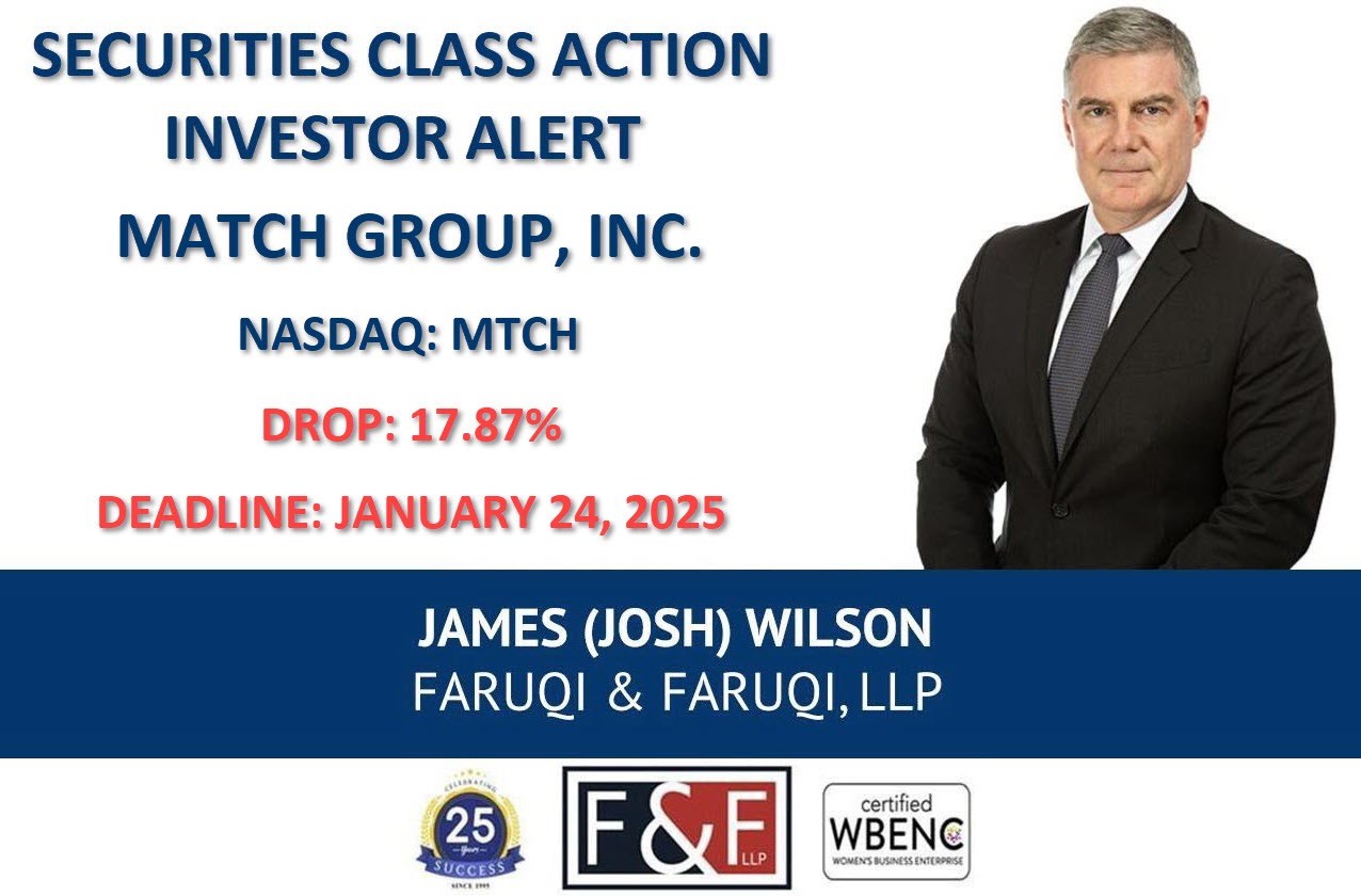 New York, New York--(Newsfile Corp. - December 17, 2024) - Faruqi & Faruqi, LLP, a leading national securities law firm, is investigating potential claims against Match Group, Inc. ("Match" or the "Company") (NASDAQ: MTCH) and reminds investors of the January 24, 2025 deadline to seek the role of lead plaintiff in a federal securities class action that has been filed against the Company.