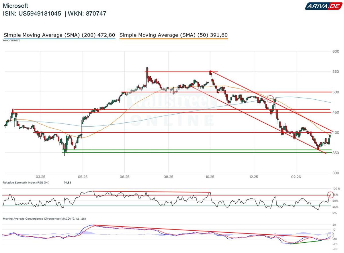 Vorstöße darüber oder darunter dürften rasch wieder eingefangen werden. Ist das nicht der Fall, deutet das auf einen neuen nachhaltigen Trend hin. Das bedeutet, dass die Microsoft-Aktie für Kurse unter 350 US-Dollar eine Verkaufsposition ist und für Notierungen dauerhaft (mindestens auf Wochenschlusskursbasis) über 400 US-Dollar eine Kaufposition. Dazwischen befindet sie sich in einer neutralen Akkumulationsphase.