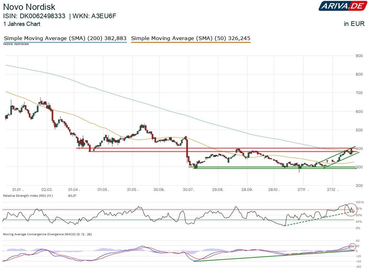 Dadurch gelang in Verbindung mit einem starken Newsflow, wie der FDA-Zulassung einer oral verabreichten Wegovy-Variante, ein dynamischer Jahresauftakt und der Sprung in den Widerstandsbereich zwischen 380 und 400 DKK (50,86 bis 53,54 Euro), wo auch die 200-Tage-Linie verläuft.