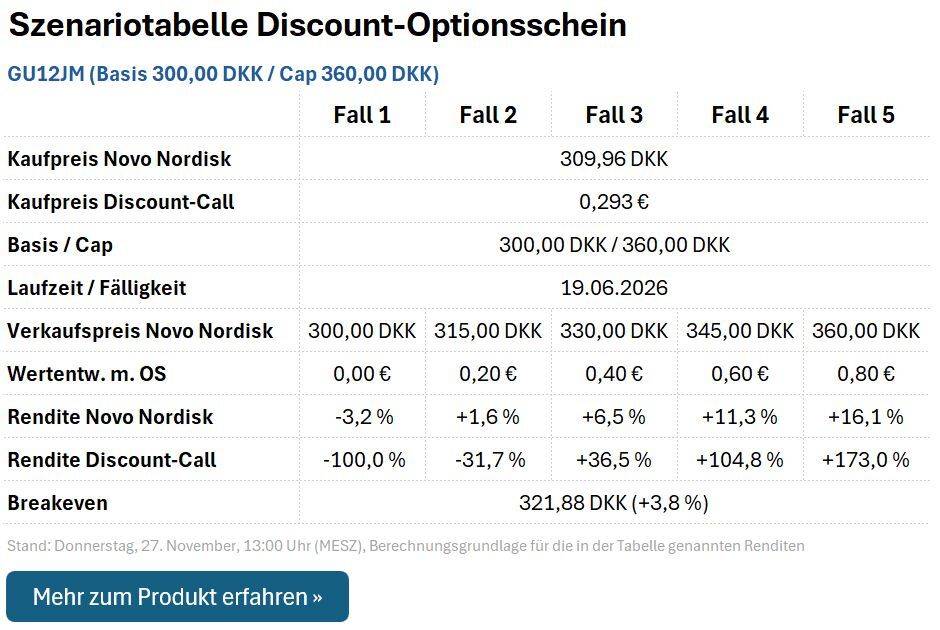 Wer auf die Dividende verzichten und lieber die Chance auf überproportional hohe Gewinne nutzen möchte, kann anstatt auf die Aktie auch auf den Discount-Optionsschein GU12JM setzen. Dieser bietet einen maximalen Auszahlungsbetrag und damit eine Rendite von +173,0 Prozent, wenn Novo Nordisk bis zum Laufzeitende am 19. Juni 2026 an die Kappungsgrenze (Cap) von 360,00 DKK (48,20 Euro) oder darüber klettert.