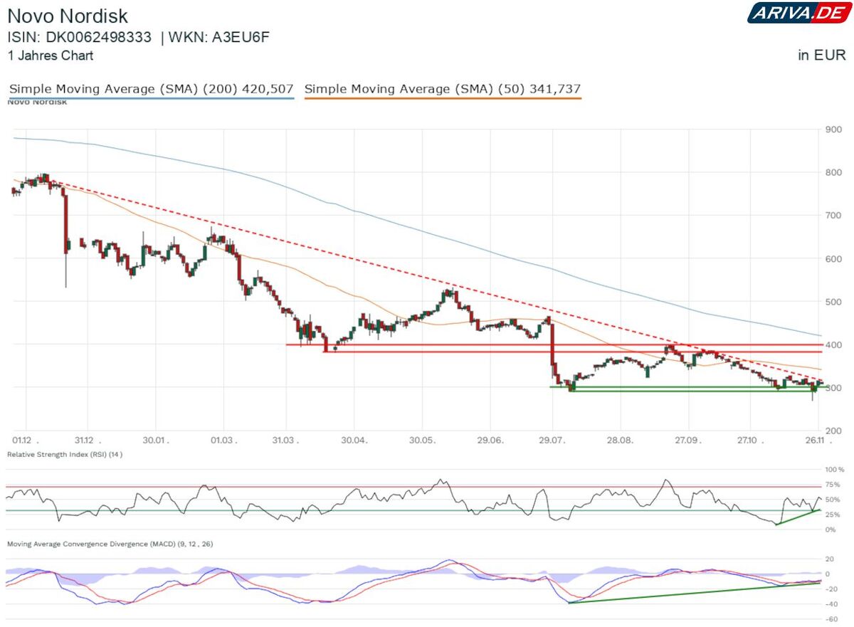 Zwar liegt er noch deutlich unter der Nulllinie und zeigt damit einen intakten Abwärtstrend an, doch die Chancen auf eine Gegenbewegung nehmen damit täglich zu. Das gilt umso mehr, als dass Novo Nordisk im Bereich von 290 bis 300 DKK (38,83 bis 40,17 Euro) selbst einen Boden gebildet hat und die Abwärtstrendlinie inzwischen selbst bei einem geringfügigen Anstieg zu überwinden wäre, was für neue Aufwärtsimpulse sorgen könnte.