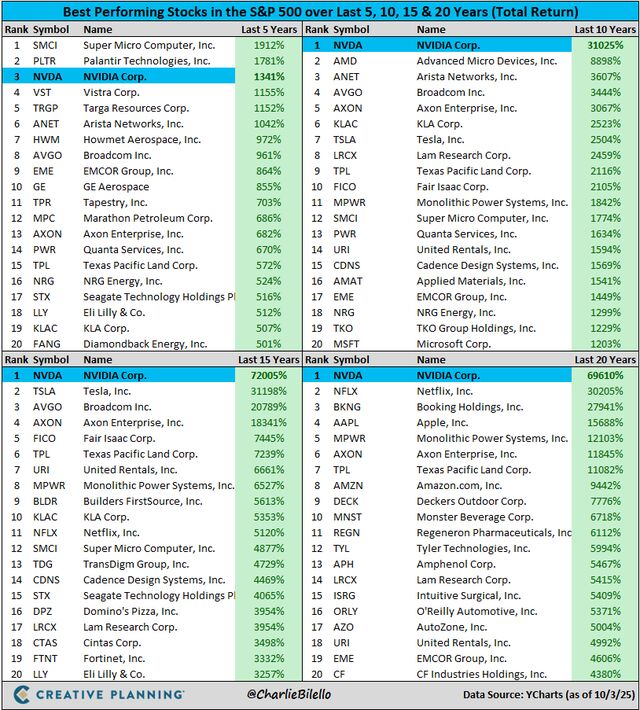 Nvidia hat in den vergangenen Jahren eine beispiellose Erfolgsbilanz an der Wall Street vorgelegt. Laut einer Analyse von Creative Planning ist die Aktie im S&P 500 die beste Performerin der vergangenen 10, 15 und 20 Jahre. In den vergangenen 5 Jahren liegt sie auf Rang drei.