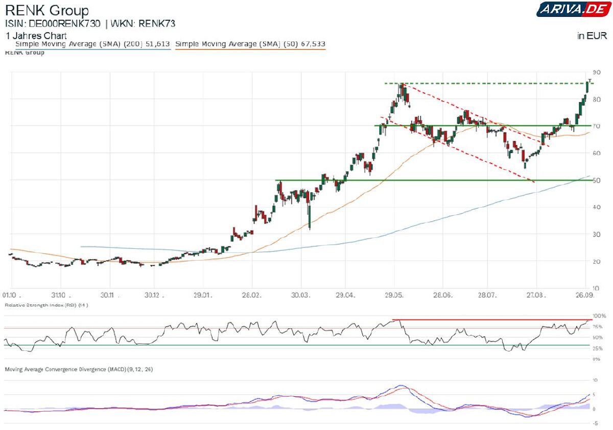 Mit Blick auf den Chart der Aktie scheint angesichts der neuen Rekordnotierungen alles in Ordnung. Tatsächlich stellen Allzeithochs starke Kaufsignale dar und bieten die Chance auf Anschlussrallyes. Allerdings ist Renk mit Blick auf den Relative-Stärke-Index (RSI) bereits überkauft. Außerdem konnte dieser das neue Allzeithoch bislang nicht durch ein eigenes Hoch bestätigen, was die Gefahr eines Fehlsignals bedeutet.