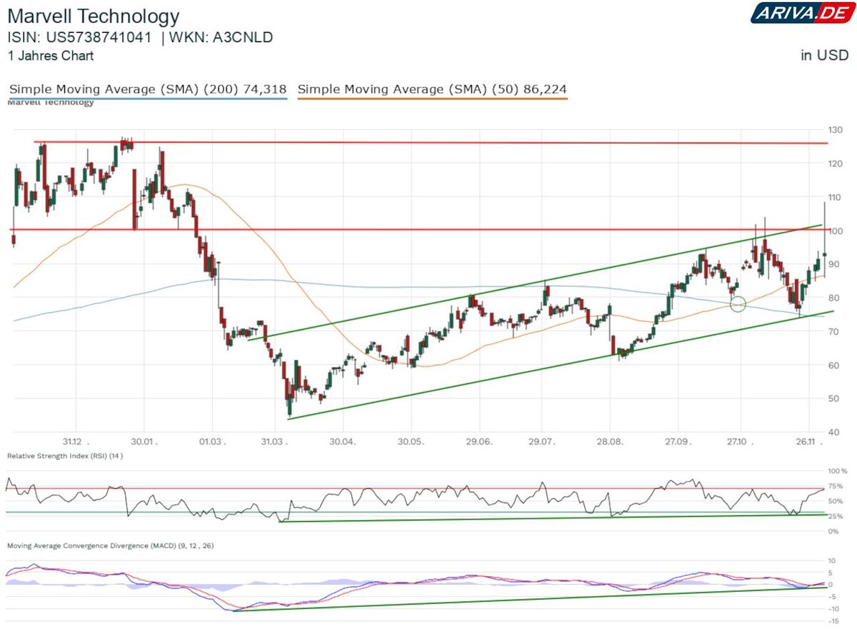 Nach 12,5 Millionen gehandelten Stücken ging Marvell schließlich mit einem Plus von 8,7 Prozent aus dem erweiterten Handel. Können diese Gewinne zur Wochenmitte verteidigt werden, notiert die Aktie erstmals seit Februar wieder über der Marke von 100 US-Dollar.
