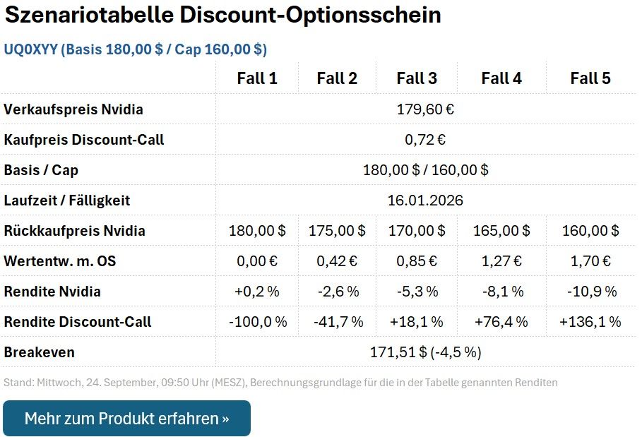 Daraus ergibt sich ein maximaler Auszahlungsbetrag von 1,70 Euro und die Chance auf +136,1 Prozent, wenn Nvidia bis zum Laufzeitende am 16. Januar auf oder unter 160,00 US-Dollar sinkt. Zwischen Basispreis und Cap wird ein anteiliger Auszahlungsbetrag fällig. Einige beispielhafte Fälle: