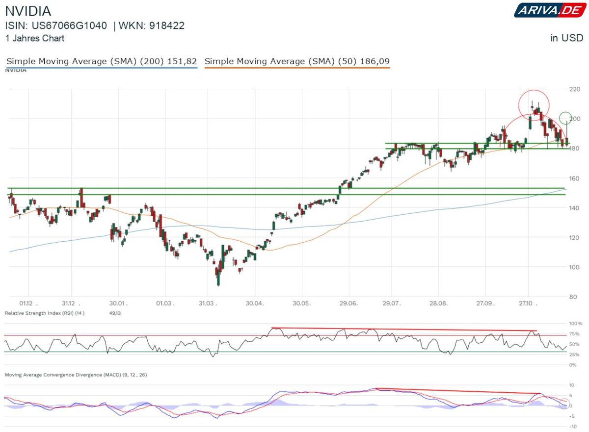 Technisch bleibt die Ausgangslage aber ein zweischneidiges Schwert: Die technischen Indikatoren weisen schon seit Monaten bearishe Divergenzen auf und deuten damit die Gefahr einer nachhaltigen Trendwende an. Andererseits hat Nvidia so eine technische Überhitzung abgebaut, was kurzfristig noch einmal zu höheren Kursen führen könnte.