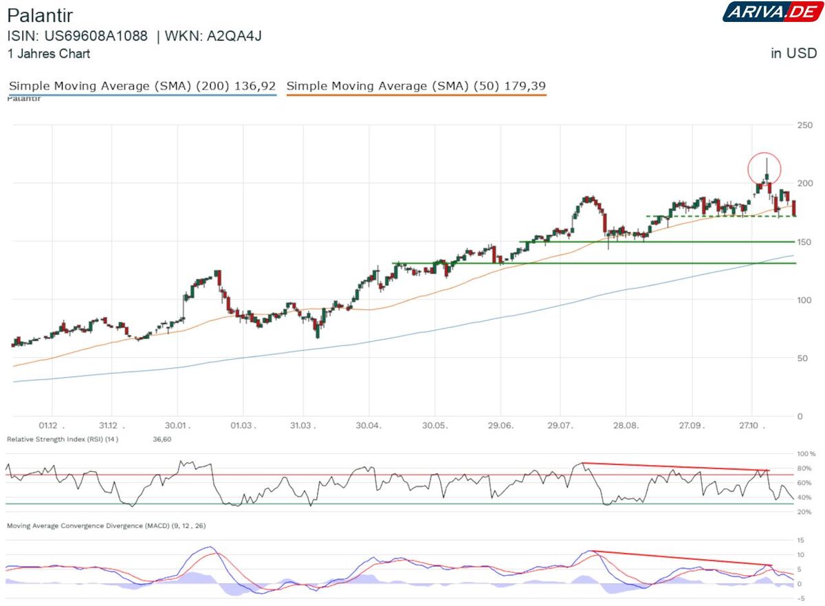 Ob Palantir in den kommenden zwei Jahren tatsächlich unter 50 US-Dollar fällt, wie es Michael Burry mit dem Kauf seiner Put-Optionen annimmt, sei dahingestellt. Doch auch der Blick in den Chart suggeriert signifikante Abwärtsrisiken, die Anlegerinnen und Anleger jetzt nicht länger ignorieren und unterschätzen sollten.