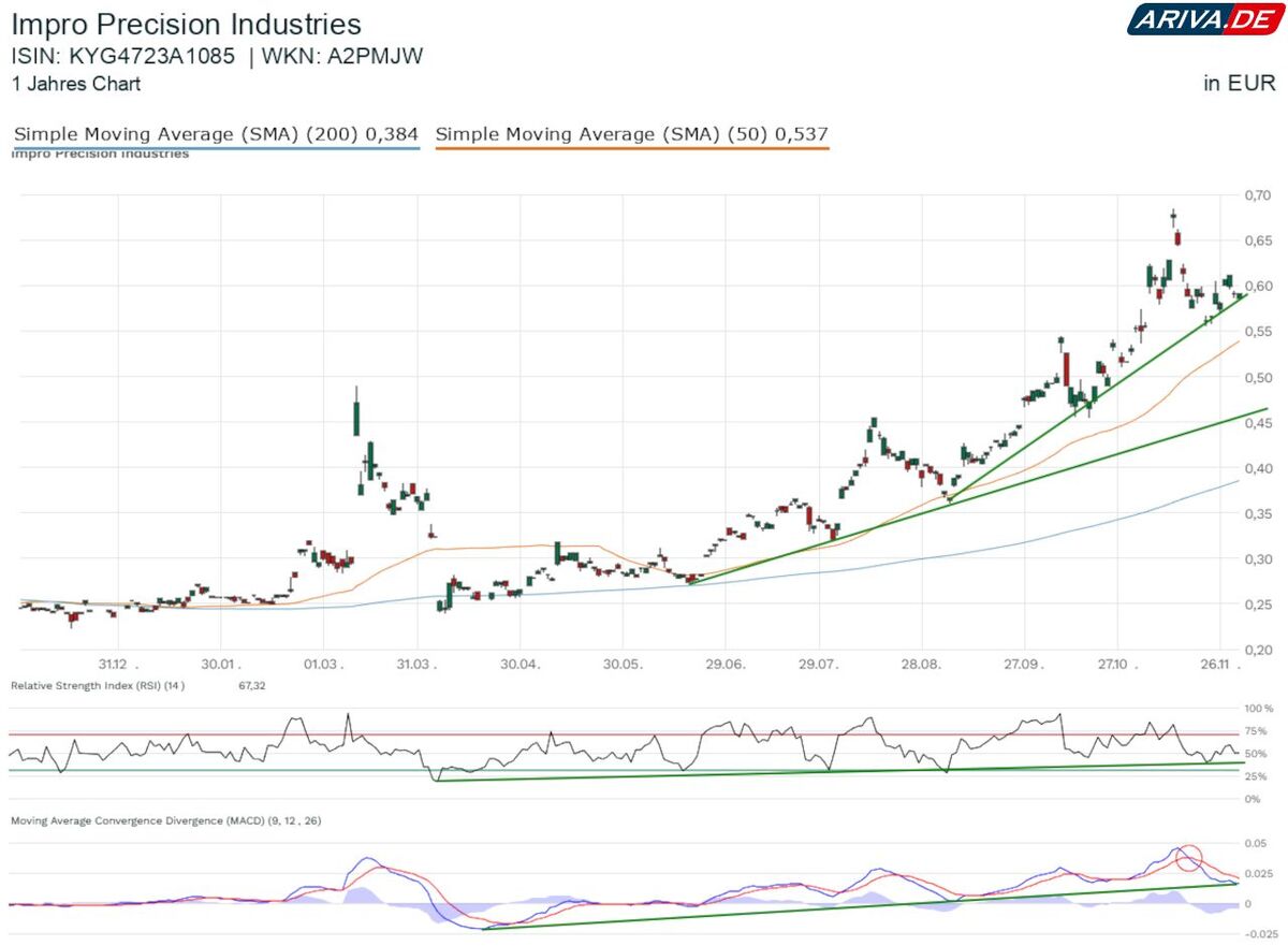 Für 2025 steht ein KGV von 14,2 zu Buche, das in 2026 auf 12,4 herabsinken soll. Dabei wird das Kurs-Gewinnwachstumsverhältnis (PEG) mit 0,9 unter dem Wert von 1,0 liegen, der in der Fundamentalanalyse als günstig gilt. Gleichzeitig bietet Impro Precision mit 3,5 Prozent für dieses und 4,1 Prozent für das kommende Jahr eine überdurchschnittlich hohe Dividendenrendite.