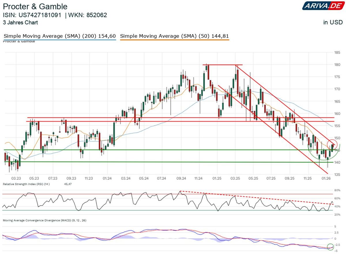 Eigentlich ist die Aktie auf gute Nachrichten angewiesen, denn trotz des frischen Tiefs, das ein technisches Verkaufssignal darstellt, konnte sich Procter & Gamble in den vergangenen Tagen über die 50-Tage-Linie und damit auch an die Abwärtstrendlinie vorarbeiten.