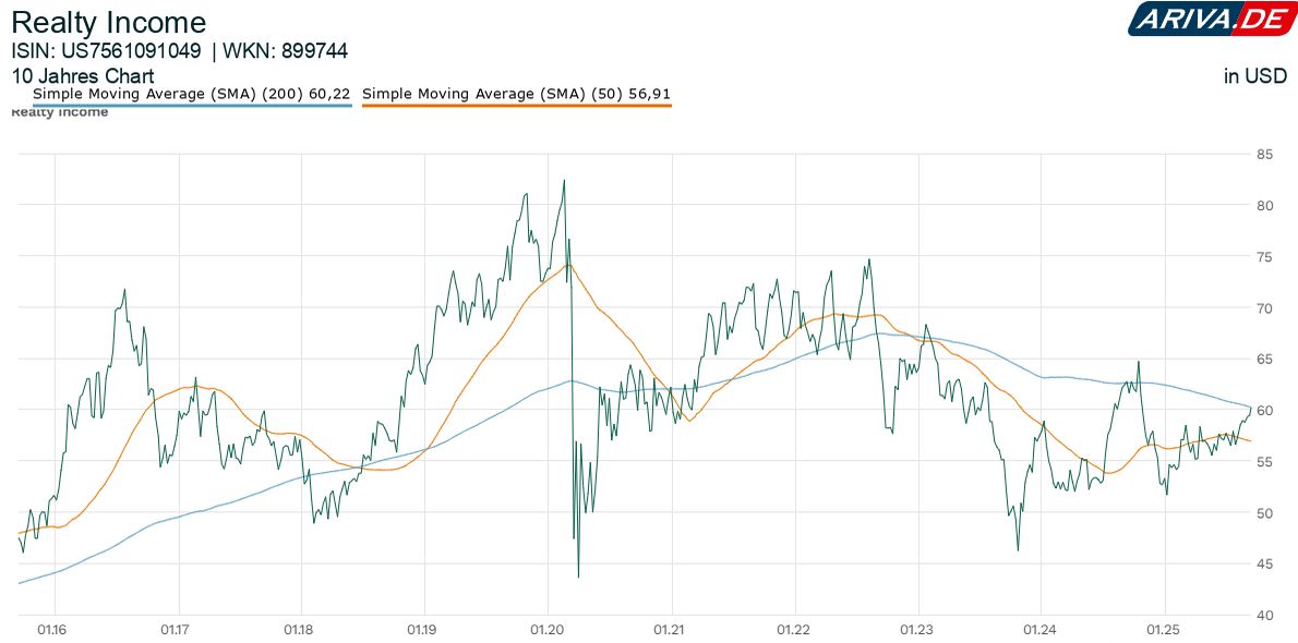 Nach eigenen Angaben hat Realty Income (Realty Income Aktie) bereits 663 monatliche Auszahlungen vorgenommen und diese 112 Quartal in Folge gesteigert. Damit bringt es der Konzern wie ITW auf eine inzwischen seit Jahrzehnten anhaltende Dividendenwachstumsgeschichte. Die CAGR lag in den vergangenen 10 Jahren bei 3,9 Prozent – genug, um die Inflation zu schlagen.