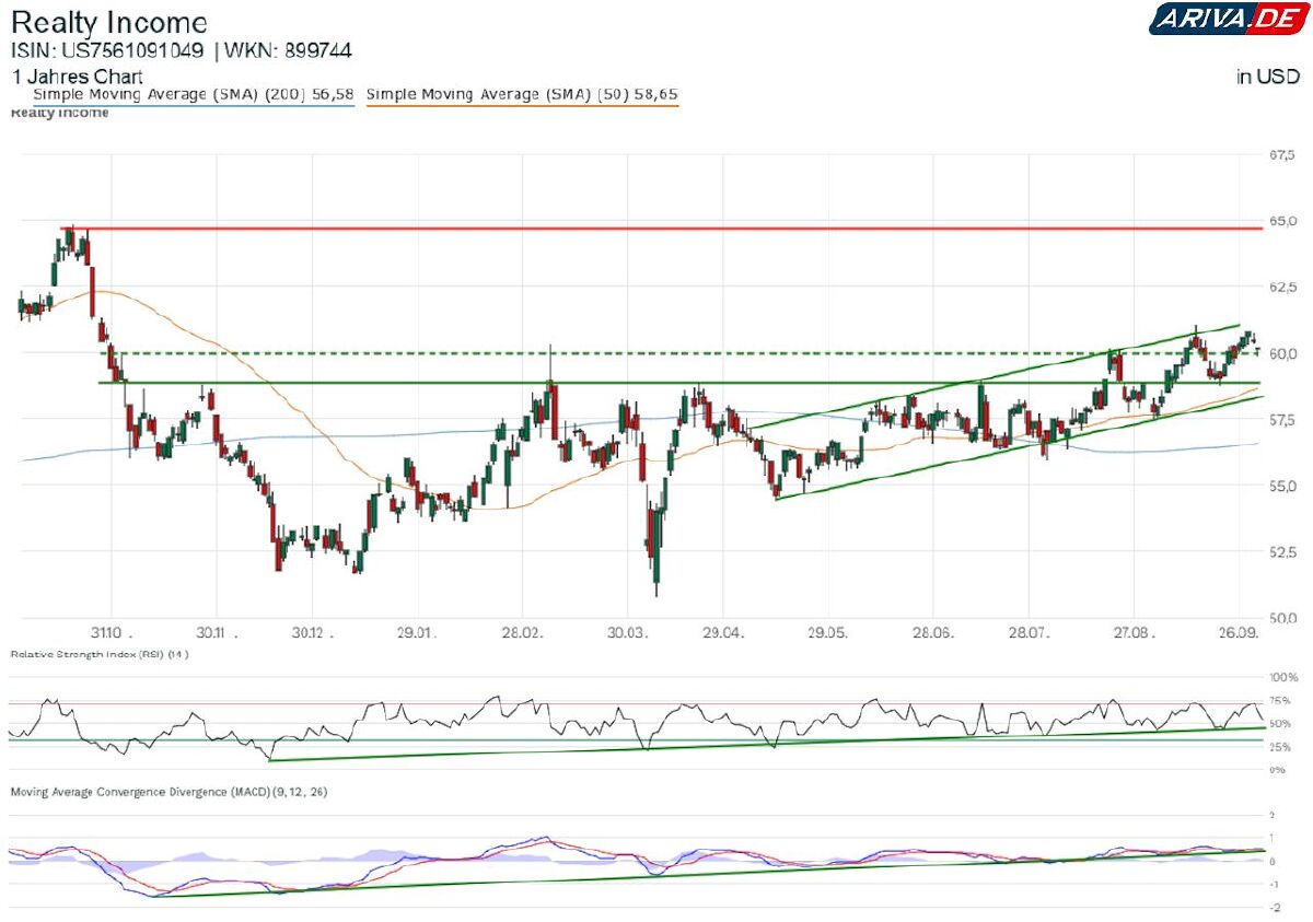Gleichzeitig verfügt Realty Income über zahlreiche Unterstützungen, während der Weg zum 52-Wochen-Hoch bei knapp 65 US-Dollar abgesehen von der Aufwärtstrendoberkante nicht von weiteren Hürden verstellt wird. Damit könnte die Aktie vor einer Aufwertung um bis zu 10 Prozent stehen.