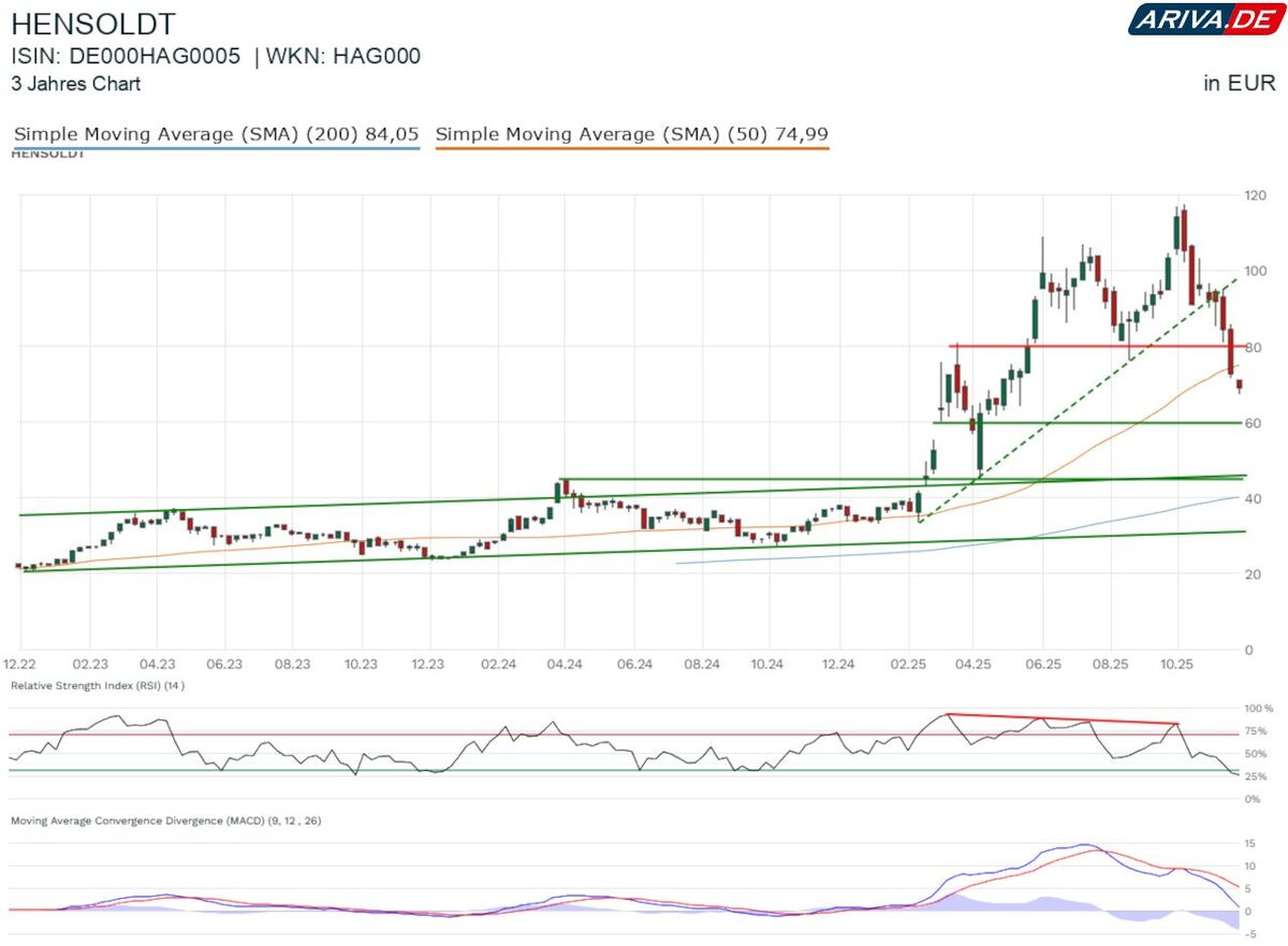Während sich Renk und Rheinmetall am Dienstag bereits deutlich erholen konnten, fiel der Rebound beim Spezialisten für elektronische Kampfführung und Luftverteidigung Hensoldt deutlich verhaltener aus. Ist die Aktie nach Verlusten in Höhe von 41,5 Prozent ausgehend vom Allzeithoch bereits einen Einstieg wert oder sollte hier weiter abgewartet werden?