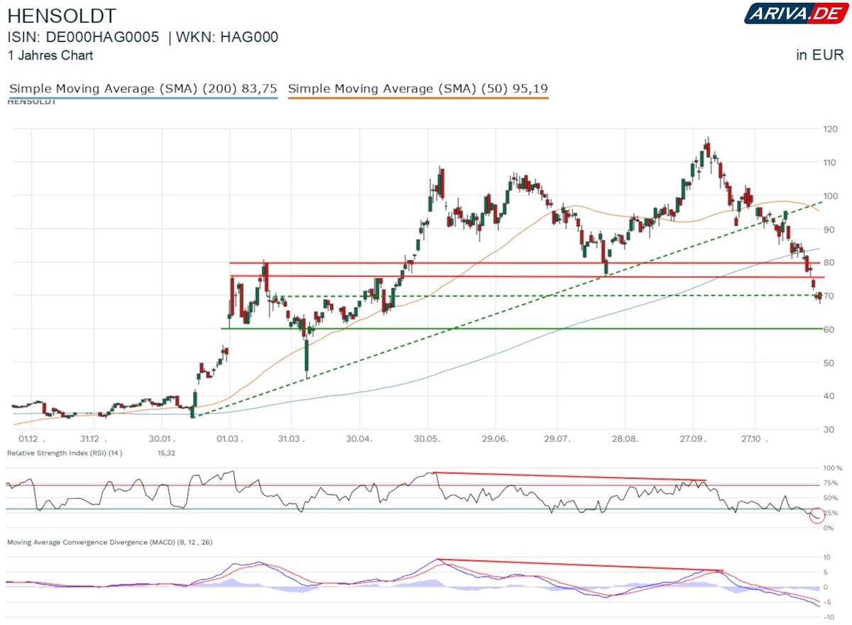 Aus technischer Perspektive sind für die starke Kehrtwende bearishe Divergenzen in den technischen Indikatoren RSI und MACD verantwortlich: Das Allzeithoch bei 117,70 Euro Anfang Oktober konnte nicht durch entsprechende Hochs in den Indikatoren bestätigt werden, was die Aktie zunehmend für eine Korrektur anfällig gemacht hatte.