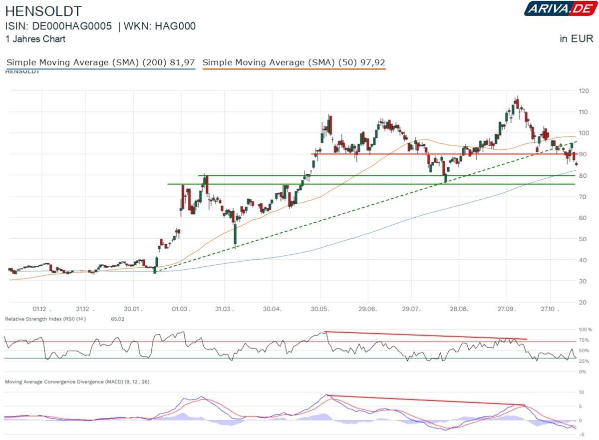 Dieses Risiko sollte nicht unterschätzt werden, denn trotz des Allzeithochs im Oktober braut sich bei Hensoldt schon seit Monaten eine potenzielle Trendwende zusammen. Sowohl im RSI als auch im MACD liegen bearishe Divergenzen vor. Beide Indikatoren fallen gegen den Trend der Aktie und konnten das Allzeithoch so nicht bestätigen.