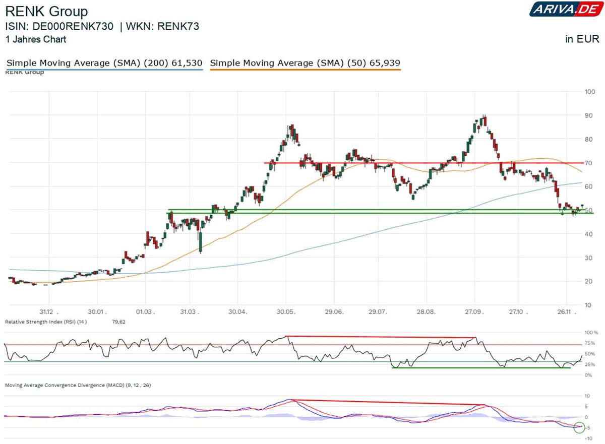 Im Bereich von 50 Euro ist die Renk-Aktie auf Kaufinteresse gestoßen. Kurzfristig hat sich ein Boden gebildet, nachdem das Papier unter seine gleitenden Durchschnitte und damit wichtige Unterstützungen gefallen war. Begleitet wurde die kurzfristige Bodenbildung durch einen Boden auch im RSI.