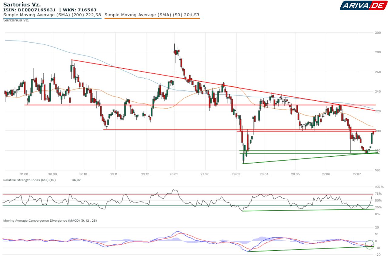 Im Zuge der Zollpanik im April fielen die Vorzüge auf ein neues Mehrjahrestief. Solche gelten in der technischen Analyse als Verkaufssignale. Dieses konnte jedoch keine Wirkung entfalten, da Sartorius bereits stark überverkauft war.