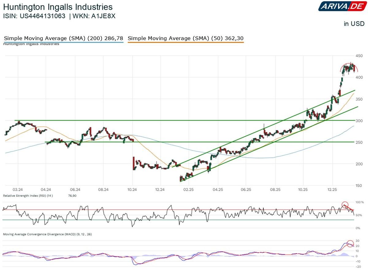 Für die Aktie des US-Marinespezialisten Huntington Ingall Industries (HII) ging es in den vergangenen 12 Monaten hoch hinaus. Um 111 Prozent hat sich das Papier angesichts weltweit steigender Rüstungsausgaben verteuert. Die Anteile profitierten außerdem auch davon, lange deutlich unter dem Branchendurchschnitt bewertet gewesen zu sein.