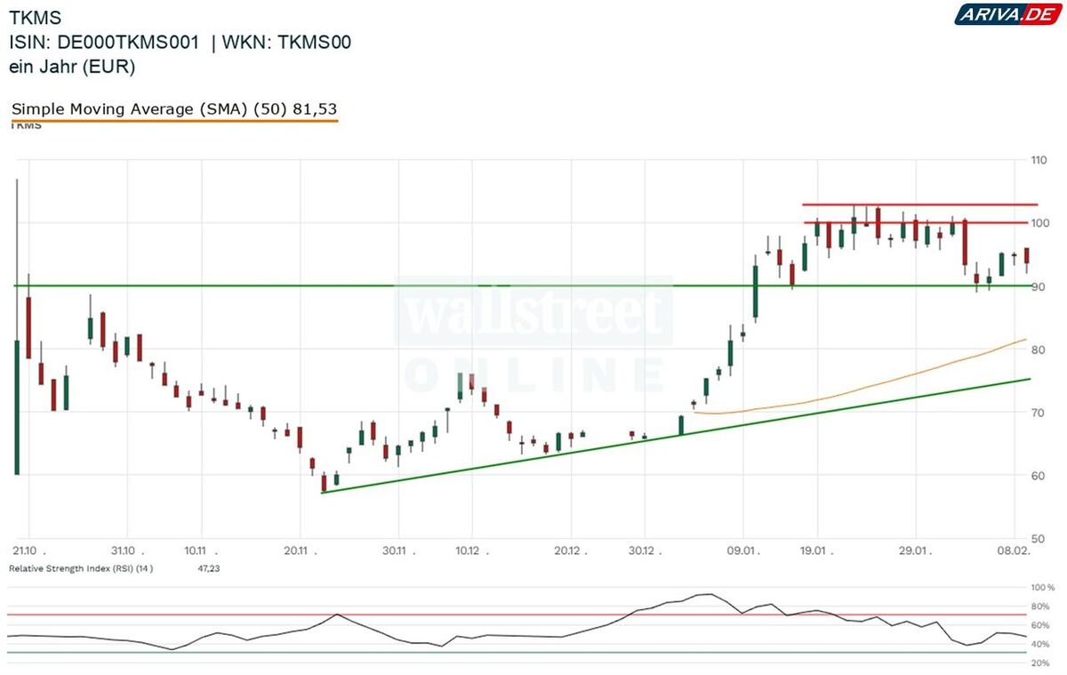 Unter 90 Euro riskiert die Aktie eine übergeordnete Top-Bildung und eine mögliche Korrektur bis zur 50-Tage-Linie bei rund 81,50 Euro beziehungsweise bis zur Aufwärtstrendlinie bei rund 75 Euro. Mit Blick auf die technischen Indikatoren hat TKMS jedenfalls bereits eine Menge des Schwungs vom letzten Jahr eingebüßt.