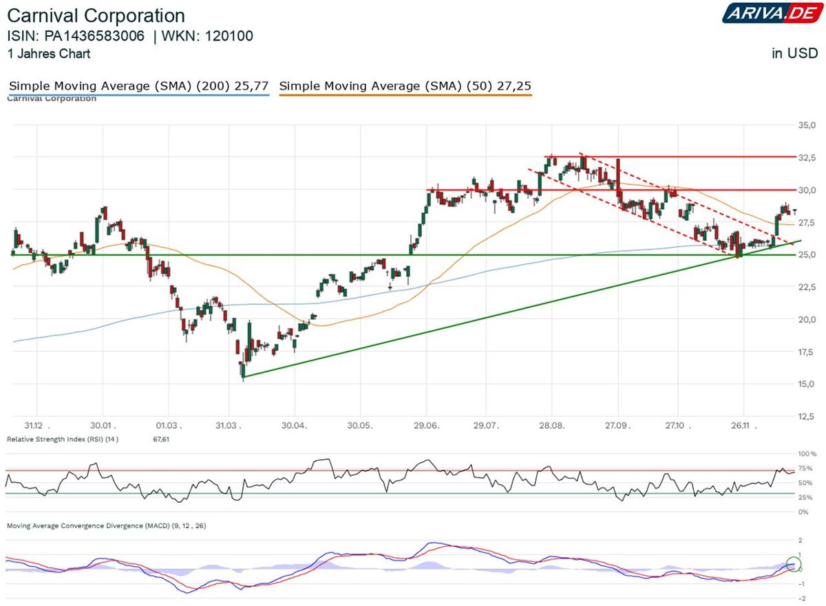 Anlegerinnen und Anleger zeigten sich über die Zahlen hocherfreut. Die Aktie legte am frühen Freitagnachmittag um fast 6 Prozent zu und näherte sich damit wieder der Marke von 30 US-Dollar. Diese Unterstützung (jetzt ein Widerstand) hatte Carnival im Oktober noch aufgeben müssen. Die Rückeroberung wäre klar bullish zu bewerten.