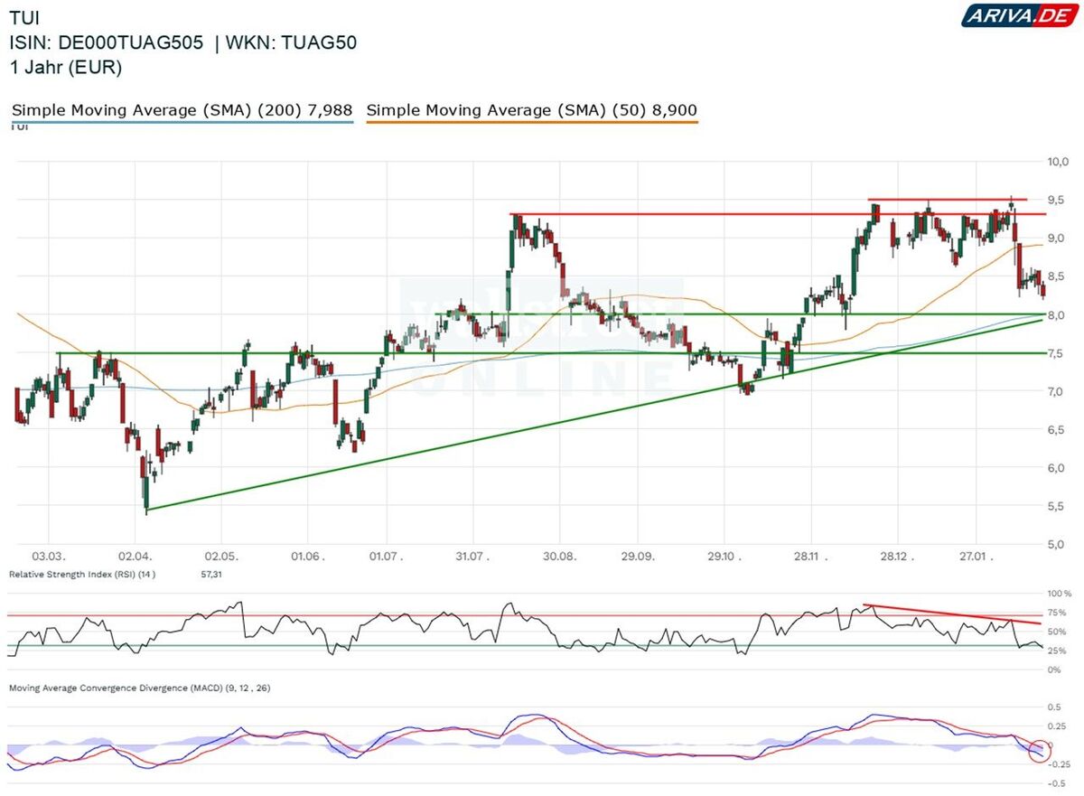 Die Top-Bildung im Bereich von 9,50 Euro wurde begleitet zunächst durch bearishe Divergenzen und schließlich eine Trendwende in den Indikatoren RSI und MACD. Das deutet auf eine nachhaltige Entwicklung hin, die für eine länger andauernde Konsolidierung der TUI-Aktie spricht.