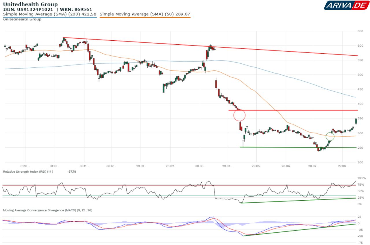 Inzwischen ist aber Vorsicht angebracht, denn der RSI ist mit einem Tageswert von 77,2 Punkten im überkauften Bereich angelangt. Damit zählt UnitedHealth innerhalb des US-Gesamtmarktindex S&P 500 inzwischen zu den zehn am stärksten überkauften Titeln. Grundsätzlich wird der Erholungstrend aber durch die technischen Indikatoren bestätigt. Solange keine bearishen Divergenzen auftreten, besteht keine akute Korrekturgefahr.
