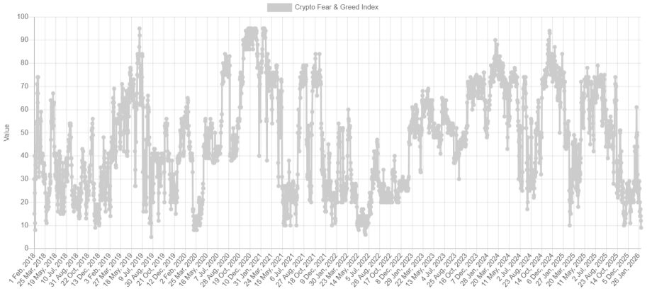 Der als Krypto-Stimmungsbarometer bekannte Fear and Greed Index steht aktuell bei 9 Punkten und damit klar im Bereich der “extreme Angst”. Damit sind die Investoren derzeit so verunsichert wie im März 2020, als der Covid-Crash ein globales Finanzmarktbeben auslösten und sowohl Bitcoin als auch die Aktienmärkte auf Talfahrt schickte.