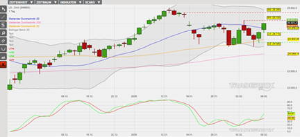 Charttechnisch befindet sich der DAX in einem langfristigen Aufwärtstrend, welcher am 13. Januar durch ein Allzeithoch bestätigt wurde. Es folgte eine Konsolidierung, welche wiederum in der letzten Woche die Basis für eine Trendfortsetzung gelegt haben könnte. Dieses Szenario wird durch die Kursanstiege vom Montag, dem 9. Februar, bestätigt. Hierdurch weisen derzeit die gleitenden Durchschnitte der letzten 20, 50 sowie 200 Börsentage (= GD 20, GD 50 sowie GD 200) und auch die Slow Stochastik Kaufsignale aus. Der gestrige Kursanstieg könnte wiederum die Basis für Anschlusskäufe in Richtung des oberen Bollinger-Bandes gelegt haben.