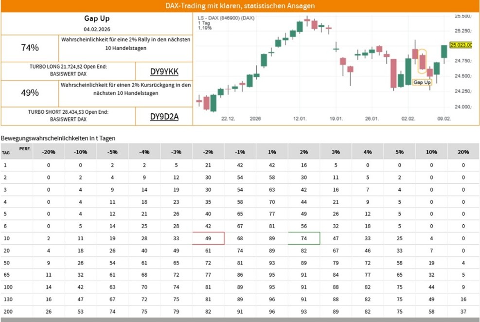 Die Erfolgswahrscheinlichkeiten für das Signal „Gap Up“ beruhen auf einer historischen Auswertung des Signals auf den LS-DAX im Zeitraum vom 02.01.2000 bis zum 09.02.2026. Dabei wurden die folgenden Voreinstellungen und Filter vorgenommen: