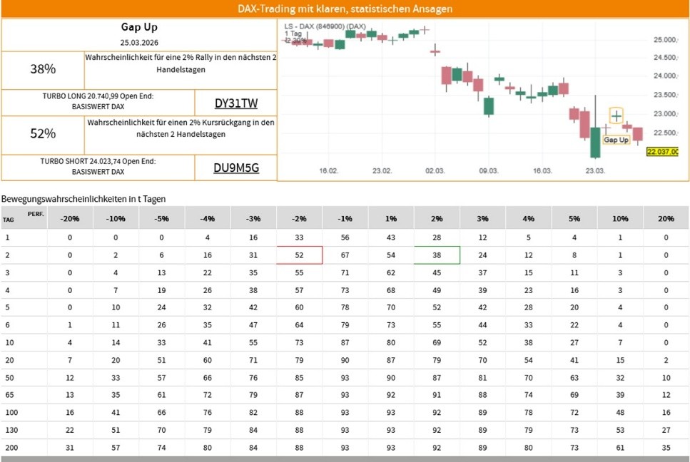 Die Erfolgswahrscheinlichkeiten für das Signal „Gap Up“ beruhen auf einer historischen Auswertung des Signals auf den LS-DAX im Zeitraum vom 02.01.2000 bis zum 26.03.2026. Dabei wurden die folgenden Voreinstellungen und Filter vorgenommen: