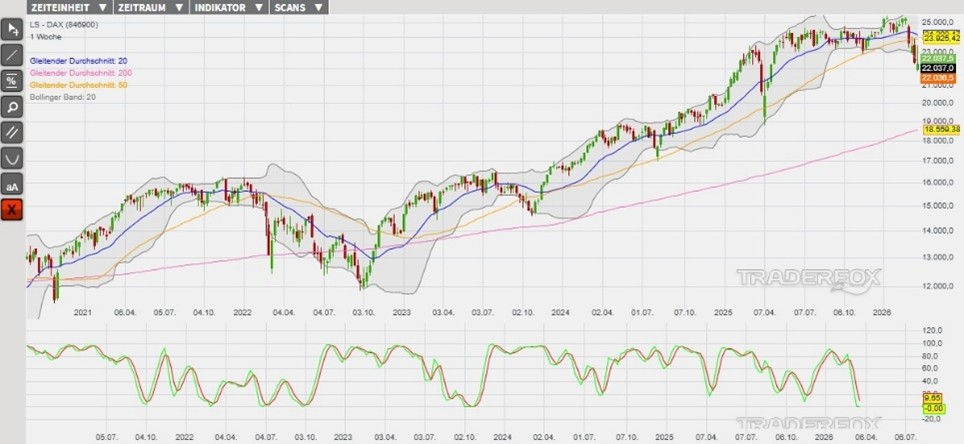 Nachdem der DAX am Freitag zunächst fester gestartet war, musste er seine anfänglichen Zugewinne aufgrund erneut steigender Ölpreise wieder komplett abgeben. Nach schwachen Vorgaben der Wall Street ging der DAX zum Handelsende mit einem Abschlag von mehr als 1,5% im Bereich seines Tagestiefs aus dem Handel, wobei der DAX nachbörslich seine Abschläge auf mehr als -2% ausdehnen musste. Aus charttechnischer Sicht bleibt der DAX damit weiterhin in seinem übergeordneten Abwärtstrend gefangen. Solange es zu keiner klaren Einigung im Iran-Konflikt kommt, überwiegen die Risiken. Daher halten wir an unserem übergeordneten Short-Szenario fest und erwarten in den kommenden Handelstagen einen Rücklauf bis in den Bereich der Marke von 21.860 Punkten (Unterstützung 1). Wird auch diese Unterstützung unterschritten, könnte der DAX seine Abwärtsbewegung in Verbindung mit dem neu getriggerten Short-Signal in der Slow-Stochastik bis in den Bereich der Marke von 21.294 Zähler (Unterstützung 2) ausdehnen. Am heutigen Montag dürften unter anderem die Daten zur Entwicklung des Verbrauchervertrauens in der Eurozone für frische Impulse sorgen. Vorbörslich wird der DAX mit einem Kursrückgang von -0,7% getaxt. Das Short-Szenario ist hinfällig, wenn der DAX die Marke von 24.067 Punkten (Widerstand 2) überschreitet.