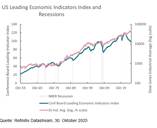 Unheimliche Monster (und Super Freaks): Halloween steht vor der Tür. Wenn Sie sich gruseln wollen, sehen Sie sich doch einmal die folgende Abbildung an. Ich habe eine Version davon diese Woche auf LinkedIn gesehen. Sie zeigt den Frühindikatorindex des Conference Board, Rezessionen in den USA und den Dow Jones Industrial Average. Den Frühindikatorindex gibt es seit 1959. In ihn fließen die Steigung der US-Zinsstrukturkurve, die Auftragseingänge in der Industrie, die Arbeitslosengeldanträge und das Kreditmengenwachstum ein. Durch KI kann zwar vieles heute anders sein, aber man kann aus der Abbildung durchaus eine baldige Rezession samt Aktienmarktkorrektur herauslesen. Frei nach dem Hexengesang in Macbeth: „Doppelt, doppelt Müh’ und Plage. KI und Preisblase, keine Frage.