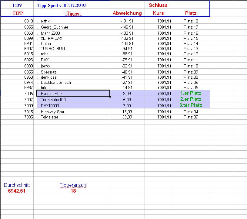 1.440.DAX Tipp-Spiel, Mittwoch, 08.12.10, 17.45 Uhr, DAX ....???