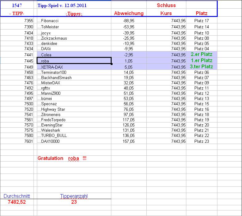 1.547. DAX Tipp-Spiel, Donnerstag den 12.05.2011, 17.45 Uhr,  DAX 7.443,95