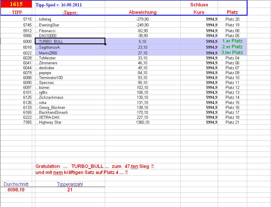 1.616.DAX Tipp-Spiel, Mittwoch, 17.08.2011,17.45 Uhr, DAX ....???