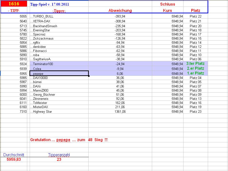 1.617.DAX Tipp-Spiel, Donnerstag, 18.08.2011