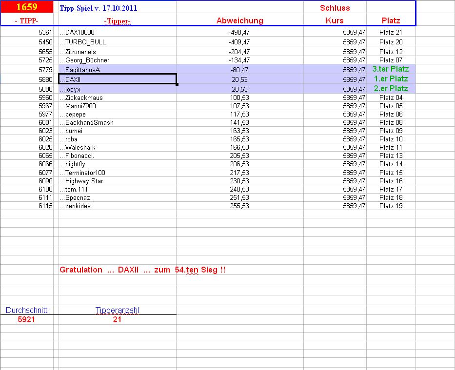 1.660.DAX Tipp-Spiel, Dienstag, 18.10.2011