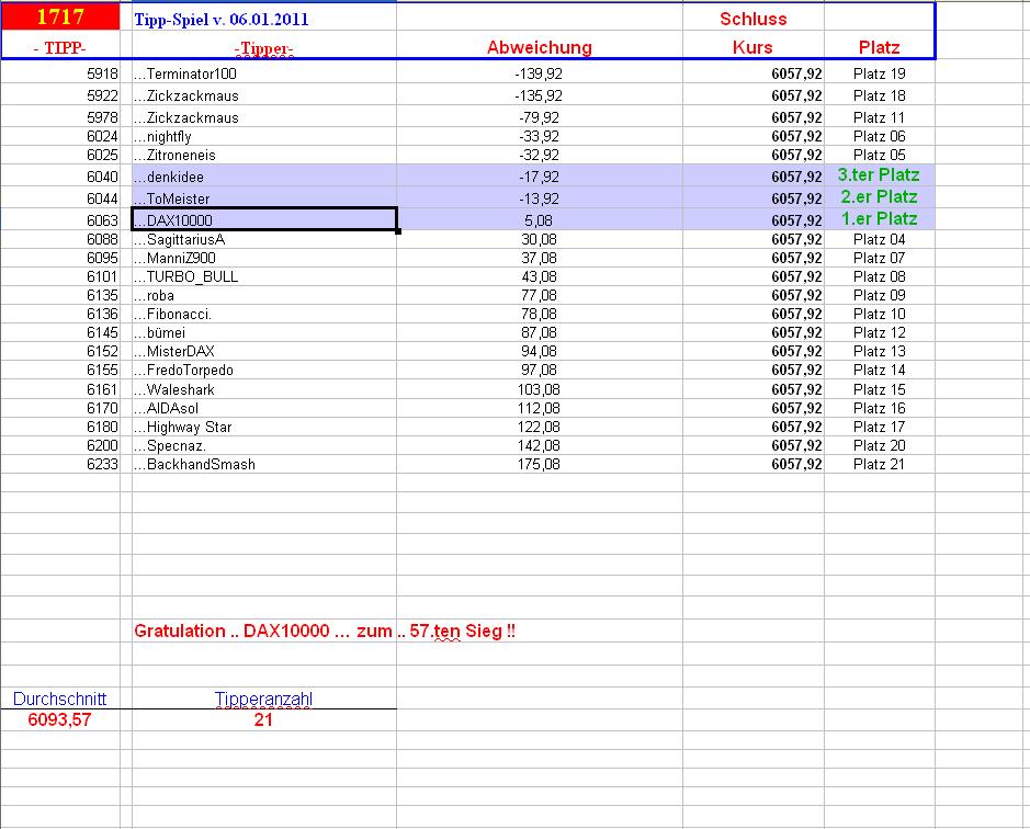 Gewinner des 1.716. DAX Tipp-Spiel, Donnerstag 05.01.2012, 17.45 Uhr,  DAX  6.095.99