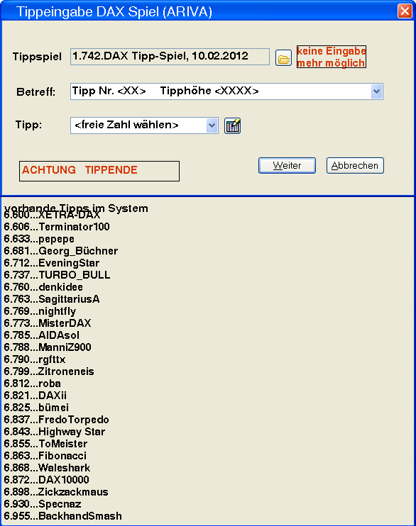 1.743.DAX Tipp-Spiel, Montag, 13.02.2012