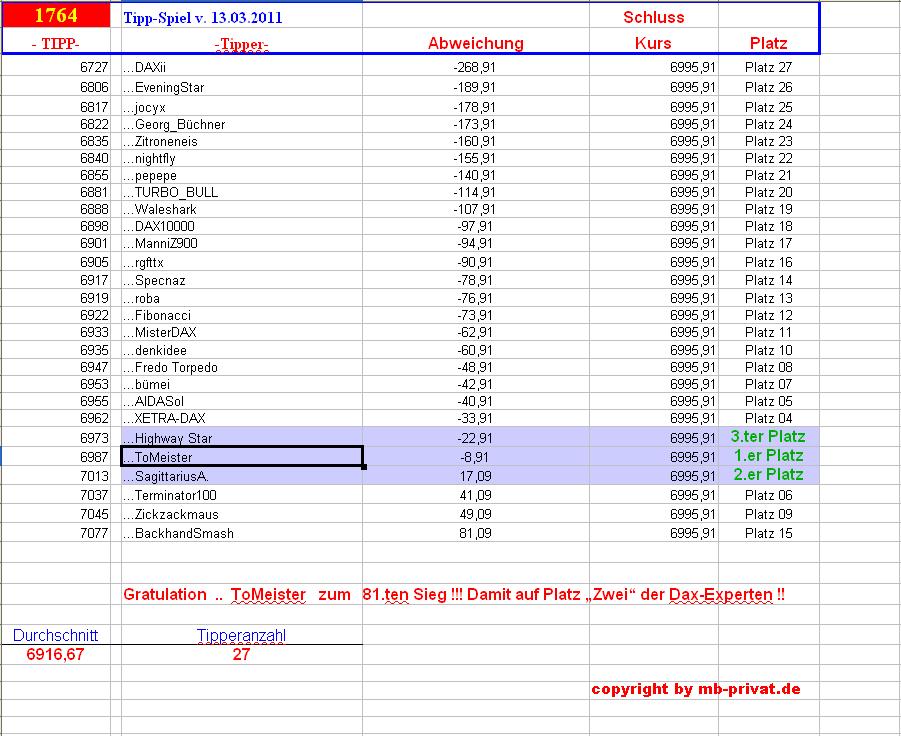 1.764. DAX Tipp-Spiel, Dienstag den 13.03.2012, 17.45 Uhr,  DAX  6.995.91