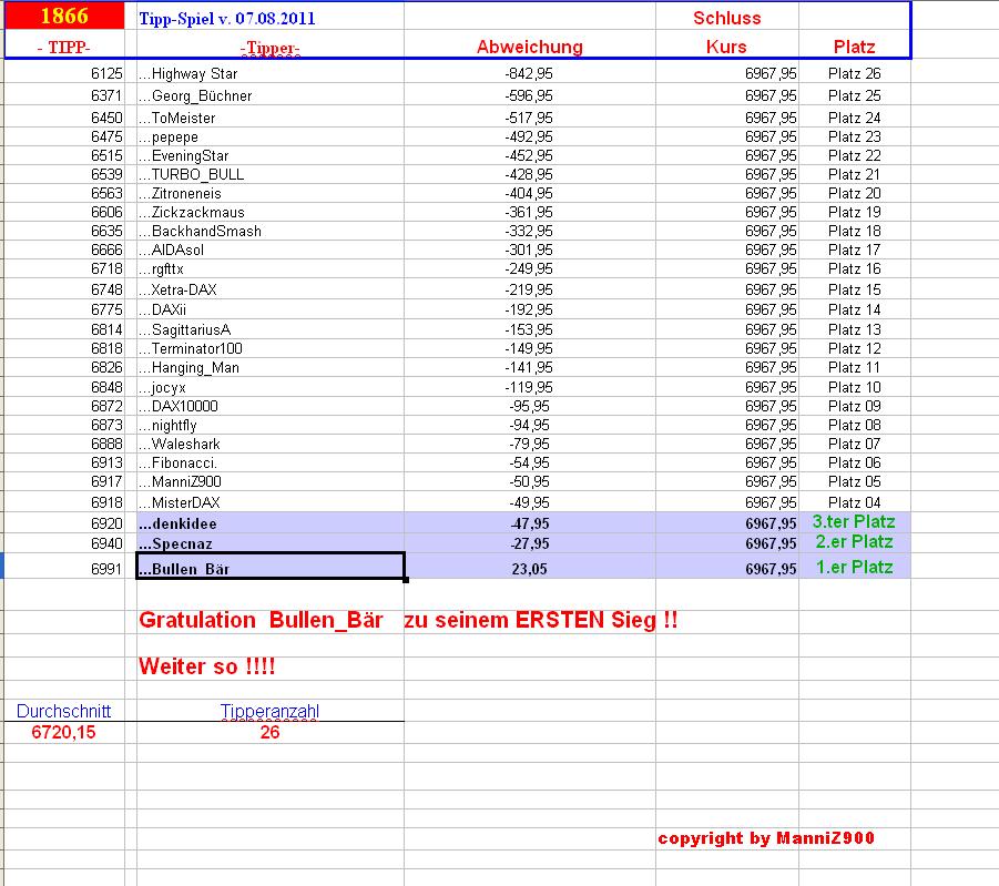 Gewinnerlinks 1.866. DAX Tipp-Spiel, Dienstag 07.08.2012, 17.45 Uhr,  DAX  6.967,95