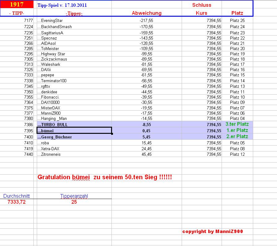 Gewinnerlinks 1.917.DAX Tipp-Spiel, Mittwoch, 17.10.2012, 17.45 Uhr, DAX 7.394,55