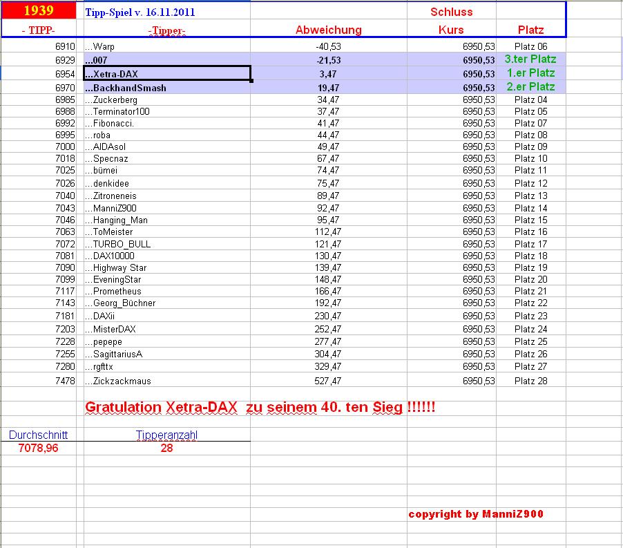 Gewinnerlinks 1.939.DAX Tipp-Spiel, Freitag , 16.11.2012, 17.45 Uhr, 6.950,53